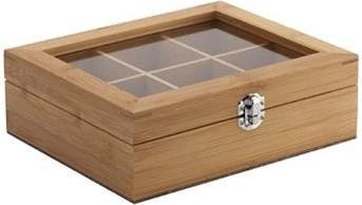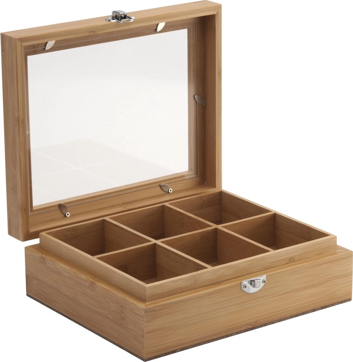 Presenteer verschillende theesmaken in deze stijlvolle 6-vaks theedoos uit de Universal collectie van Bredemeijer. De theedoos is gemaakt van mooi en duurzaam bamboe. Dit materiaal geeft het geheel een chic uiterlijk. De theedoos is voorzien van een deksel met glasvenster.