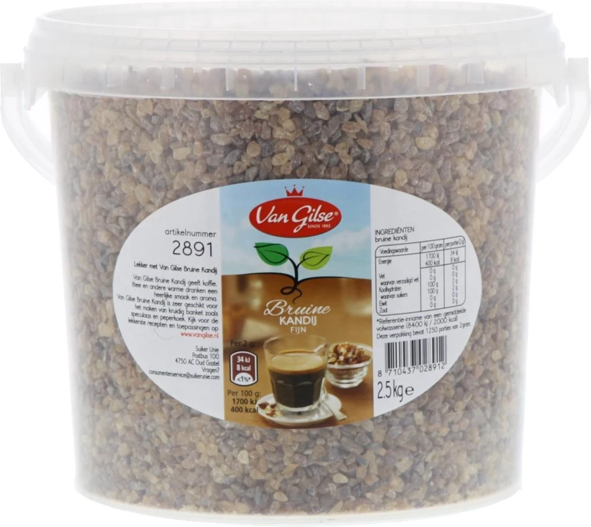 Van GIlse bruine kandij geeft koffie, thee en andere warme dranken een heerlijke smaak en aroma. Van Gilse bruine kandij is zeer geschikt voor het maken van kruidig banket zoals speculaas en peperkoek. Er zit 2,5 kg in een emmer.