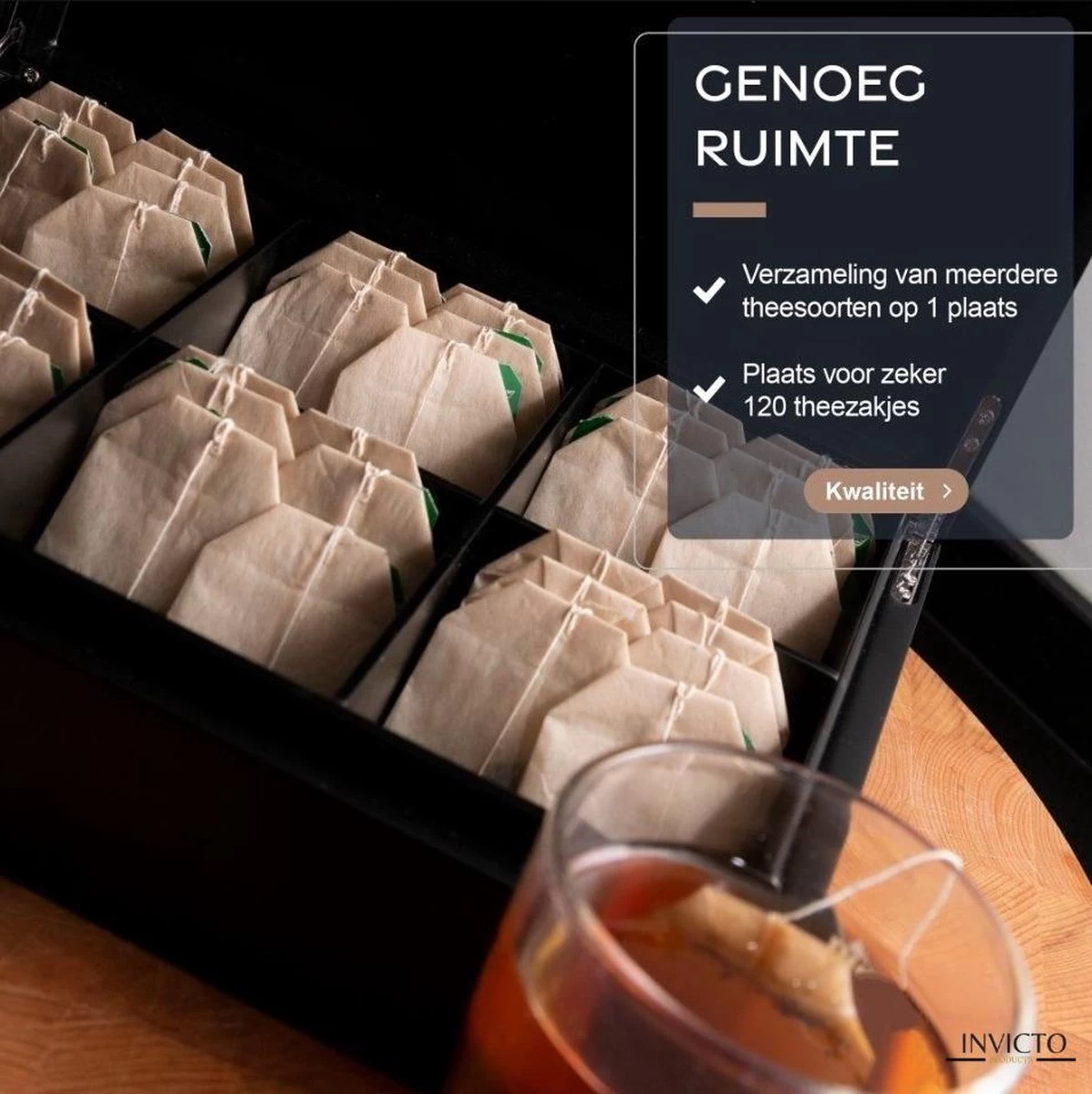 De Invicto Products Theedoos is de perfecte oplossing voor het organiseren van je favoriete theesmaken. De theedoos is voorzien van 6 vakken die plaats bieden voor maar liefst 120 theezakjes.