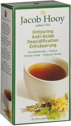 Jacob Hooy Ontzuring Thee bevat een uitgekiende kruidenmix die het lichaam helpt ontzuren. Ontzuren betekent dat je bewust bezig gaat met het afvoeren van zuren uit je lichaam.