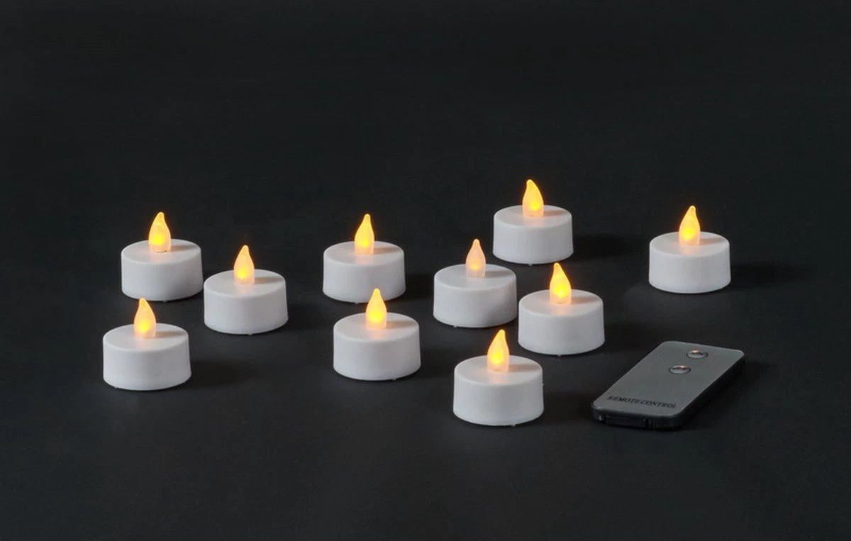 LED theelichtjes/waxinelichtjes/kaarsjes geel vlameffect met afstandsbediening 10 stuks. Waxinelichtjes of theelichtjes welke ieder werken op 1 celbatterij CR2032 (inclusief). Kerstkaarsen of home decoratie. Materiaal: kunststof.