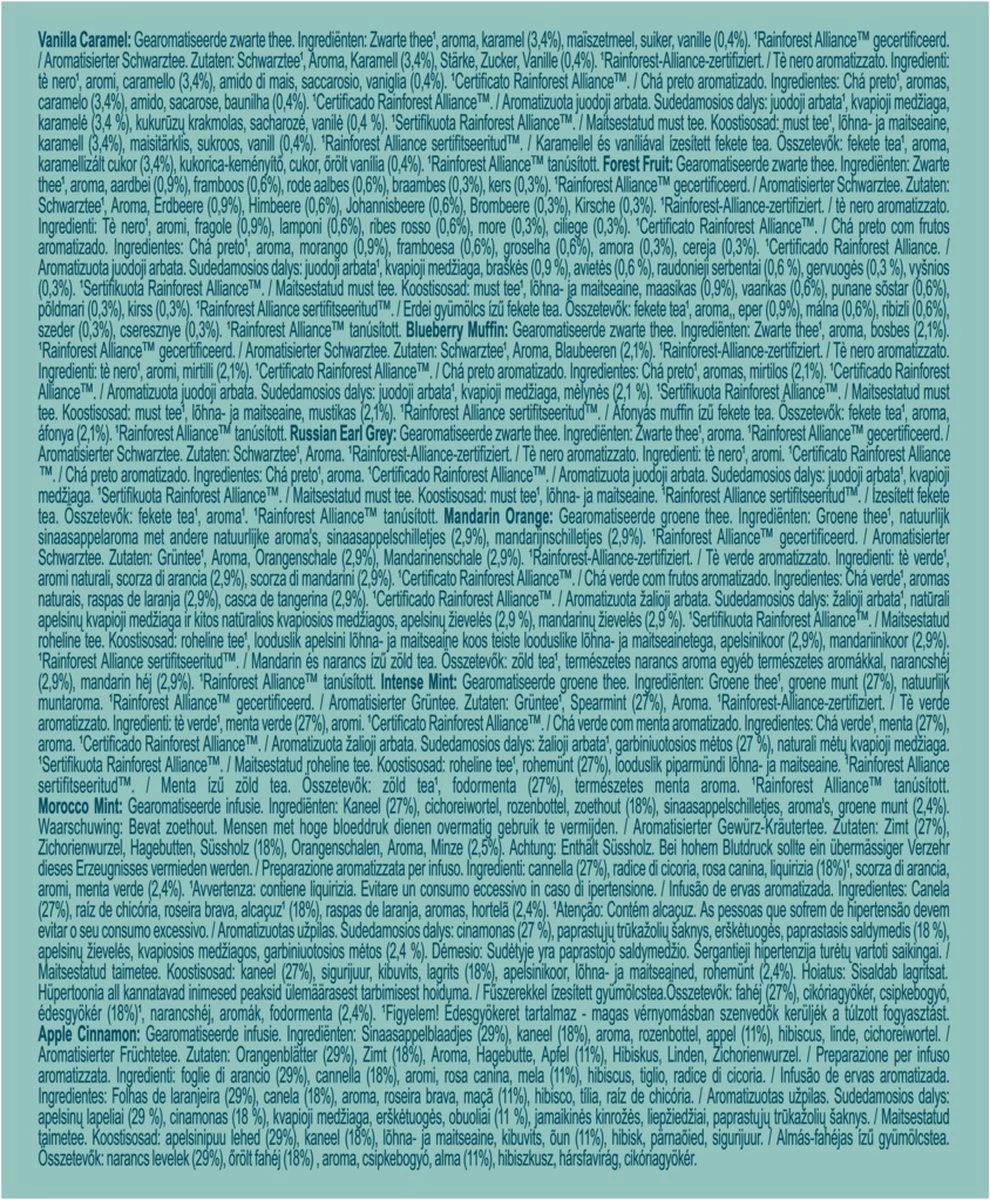 - Russian Earl Gray, Blueberry Muffin, Moroccan Mint, Vanilla Caramel, Green Tea Mandarin Orange, Green Tea Intense Mint & Apple Cinnamon Infusion.