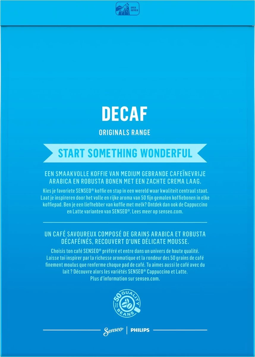 Een evenwichtige koffie van medium gebrande cafeïnevrije Arabica- en Robustabonen voor een rijke smaak, met een heerlijke crema laag. Geniet met één druk op de knop van een vers kopje Senseo® Decaf koffie.
