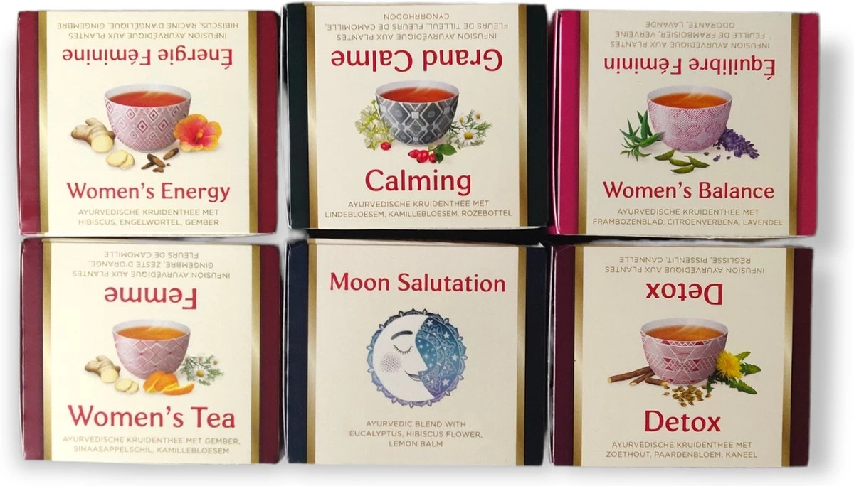 Kaneel, Kardemom, Kurkuma, Kruidnagel, Citroen, Citroengras, Citrus, Zoethout, Lindebloesem, Rozenbottel, Gember, Kamille